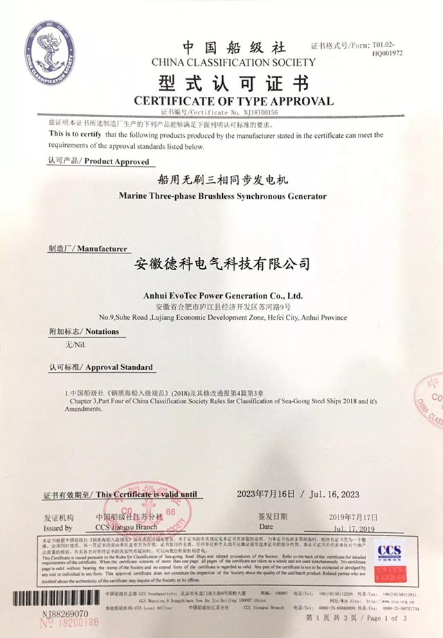 四、EvoTecPA视讯游戏船用发电机产品通过了中国船级社(CCS)认证
